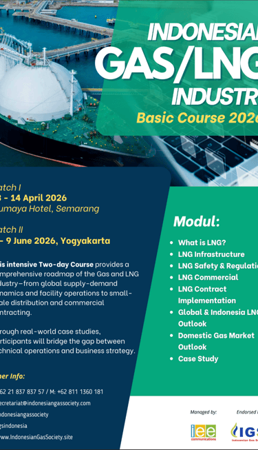 The program places strong emphasis on commercial and contractual perspectives, including LNG commercialization, contract implementation, and strategic market outlook. Practical case studies are incorporated to connect technical knowledge with commercial and business considerations, enabling a holistic understanding of gas and LNG operations and project execution. Batch I will be conducted on 13–14 April 2026 at Gumaya Hotel, Semarang.