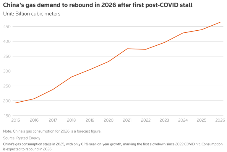 "Even if prices fall in 2026, LNG still can't compete with domestic or imported pipeline gas, which has a cost advantage, so it remains a supplemental fuel," said analyst Xiong Wei at Rystad.