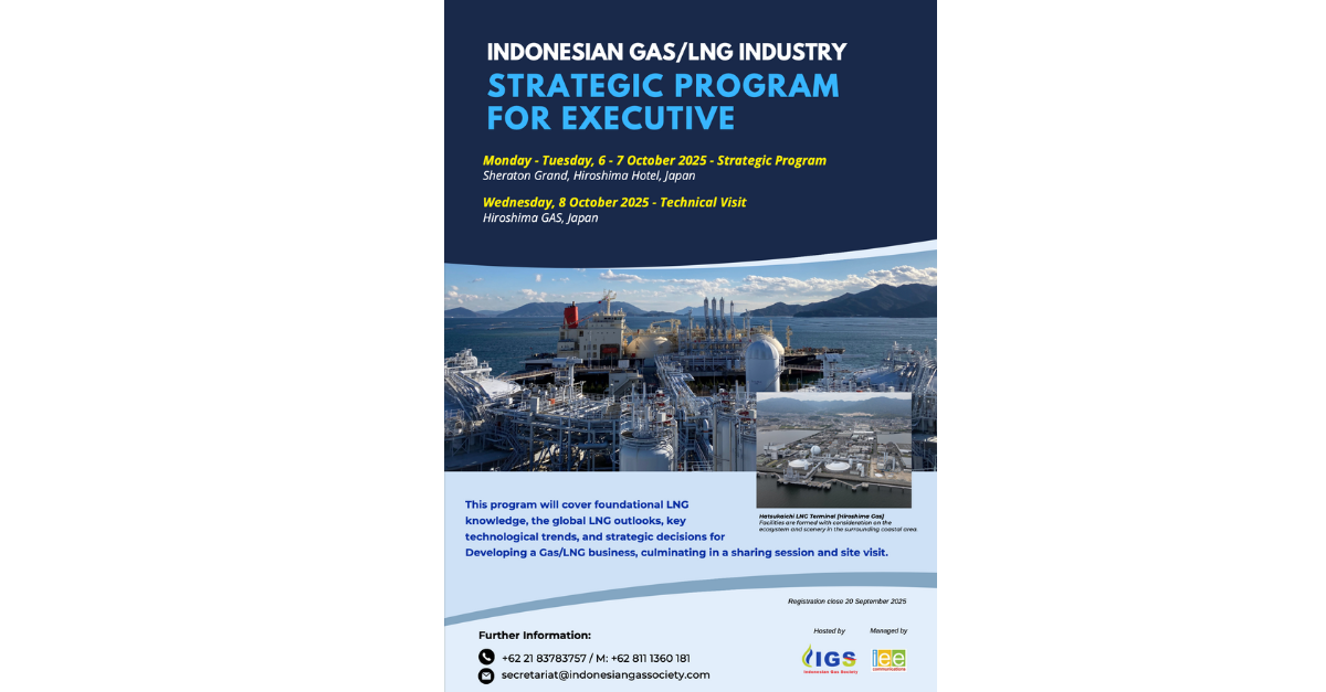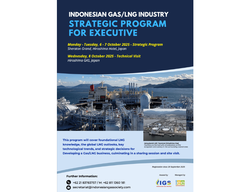 The "Indonesian Gas/LNG Industry Strategic Program for Executive" is scheduled to take place at the Sheraton Grand Hiroshima Hotel in Japan from 6 to 8 October 2025, combining strategic classroom sessions with a technical site visit. The comprehensive curriculum covers foundational LNG knowledge, global oil and gas outlooks, key technological trends, and strategic decision-making processes for developing gas and LNG businesses.